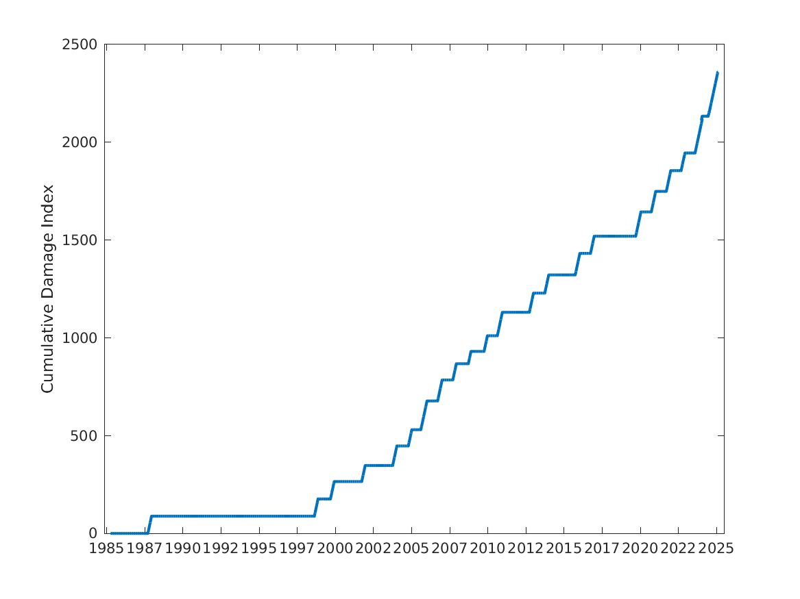 The ©Cumulative Damage Index caused by coral bleaching events (days exceeding DHW > 1) over the past 41 years