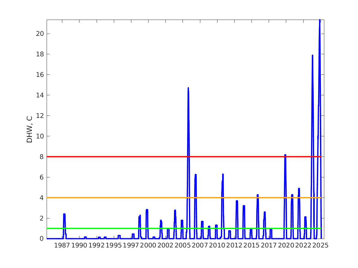 The record of Degree Heating Weeks (DHW) over the past 41 years
