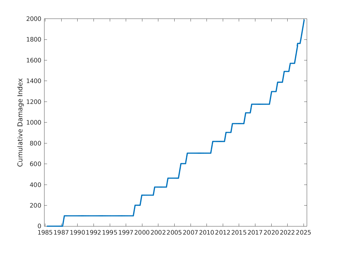 The ©Cumulative Damage Index caused by coral bleaching events (days when the DHW > 1C) over the past 41 years is 1991.