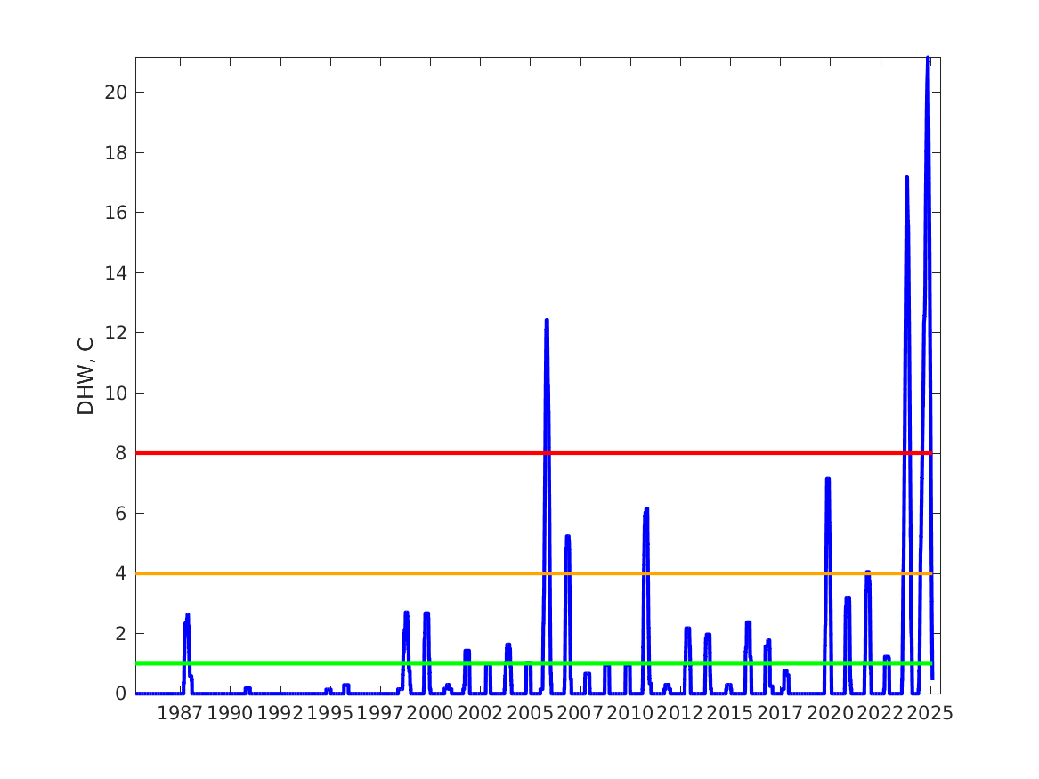 The record of Degree Heating Weeks (DHW) over the past 41 years