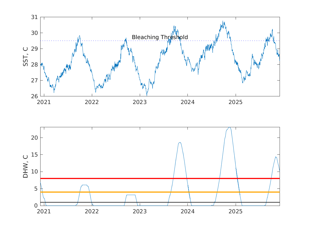 - Extreme stress - Severe Bleaching and Significant Mortality: 22-Aug-2025 to 02-Dec-2025