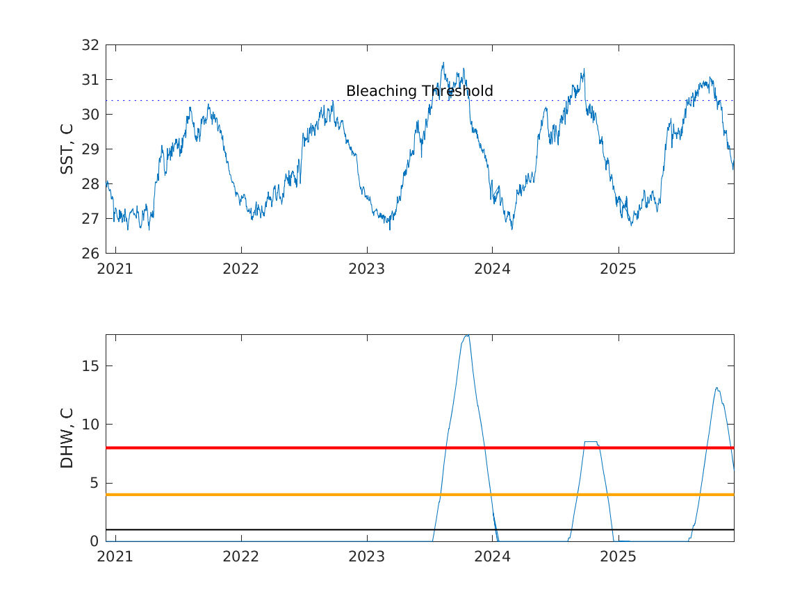 The most severe conditions for coral bleaching in the past 41 years peaked on 22-Oct-2023. The DHW reached 17.7 C.
