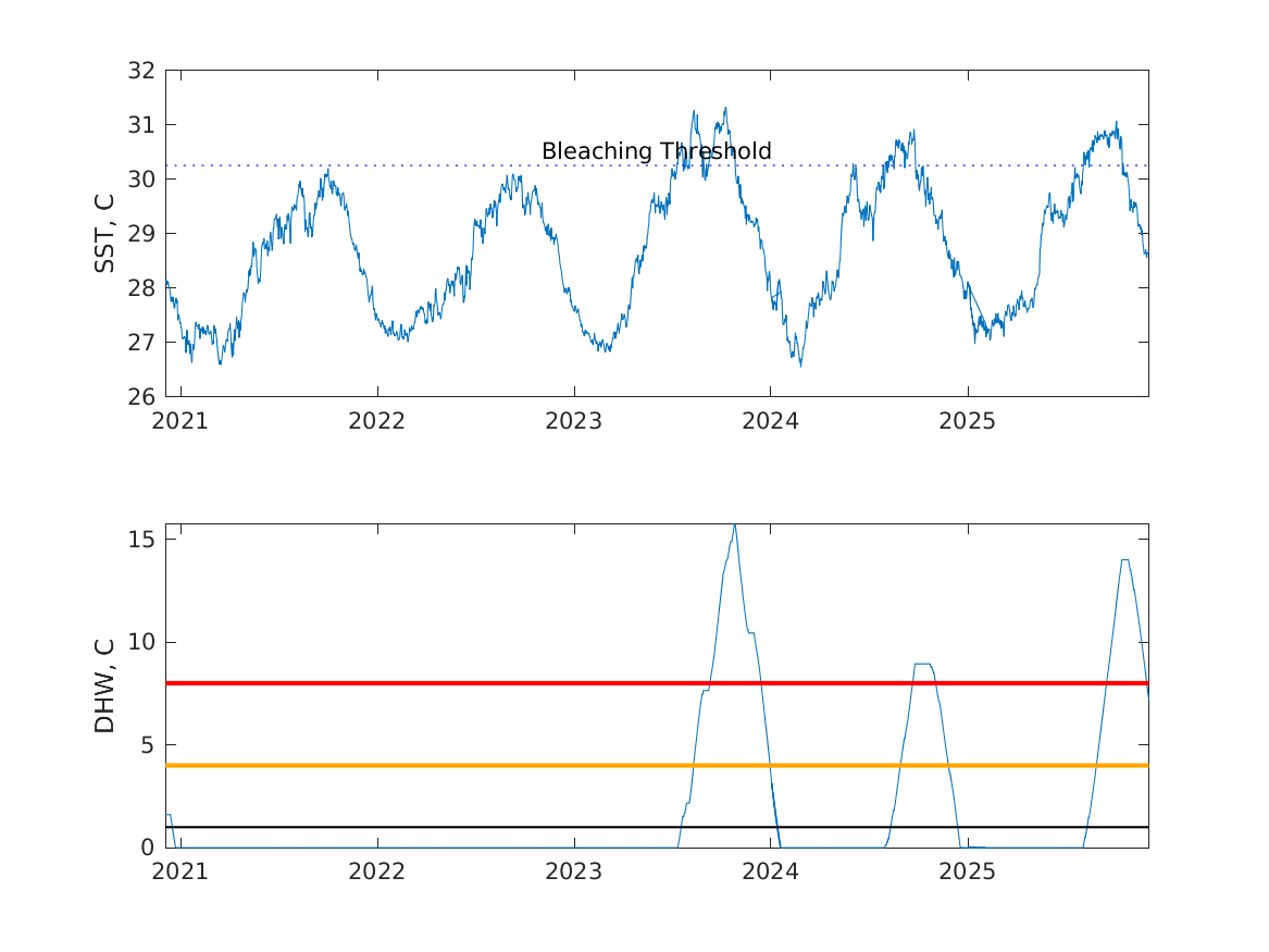- Extreme stress - Severe Bleaching and Significant Mortality: 10-Aug-2025 to 02-Dec-2025
