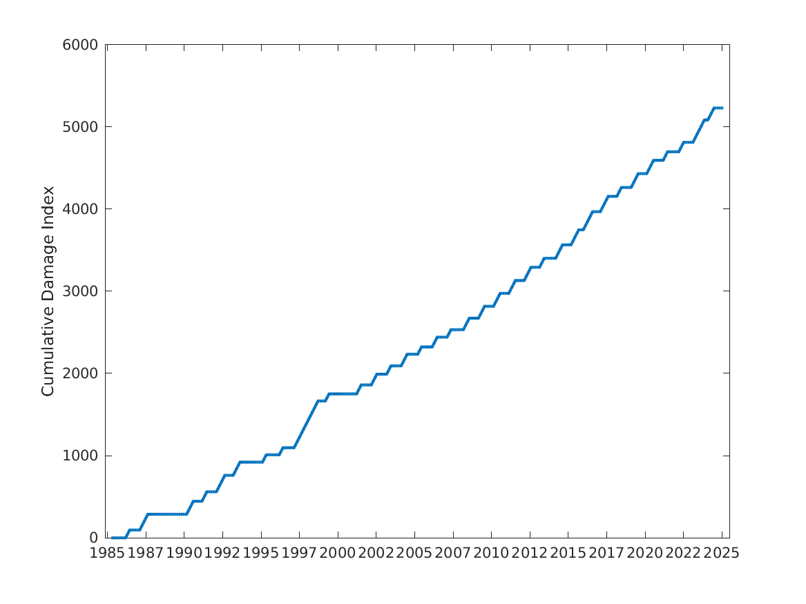 The ©Cumulative Damage Index caused by coral bleaching events (days when the DHW > 1C) over the past 41 years is 5229.
