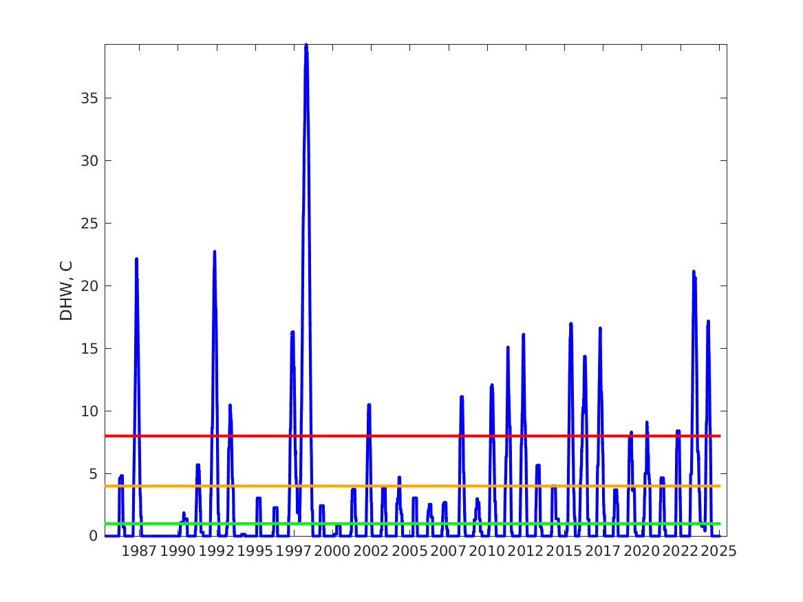 - Extreme stress - Severe Bleaching and Significant Mortality: DHW of 20.54 C on 10-May-1987